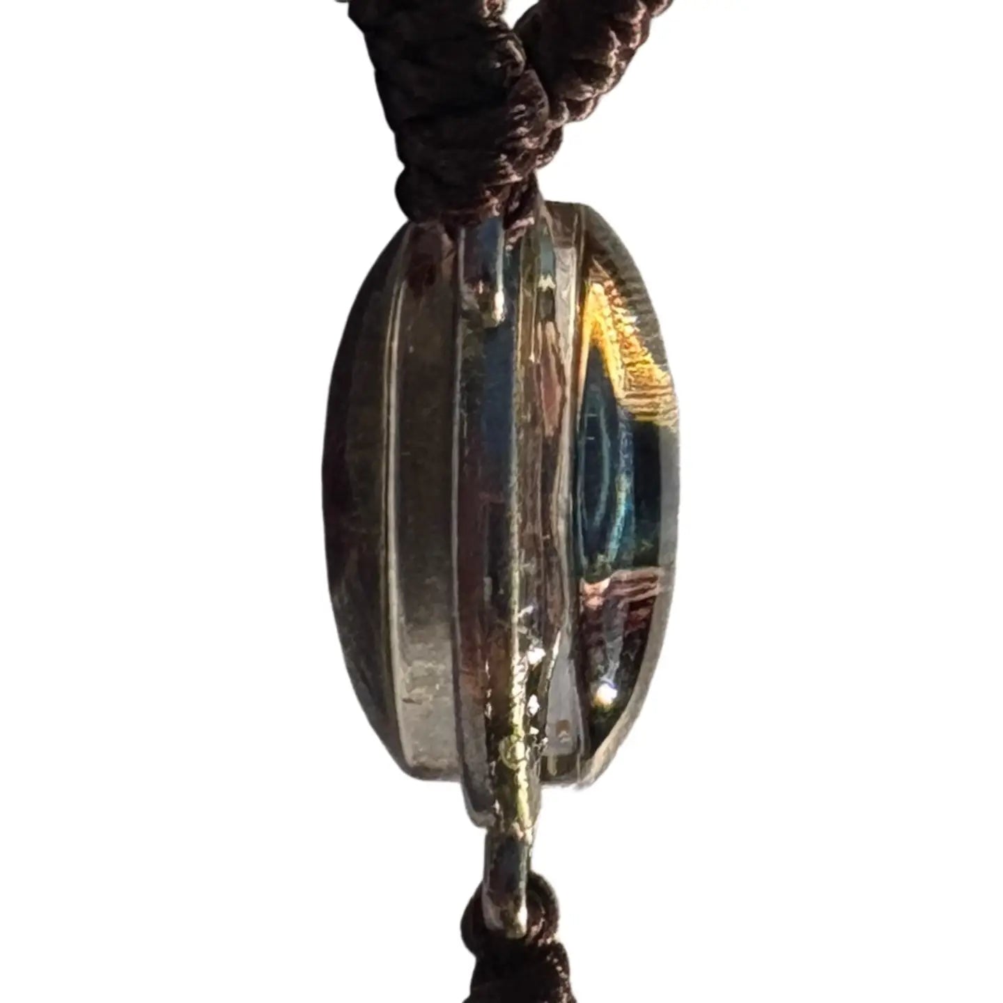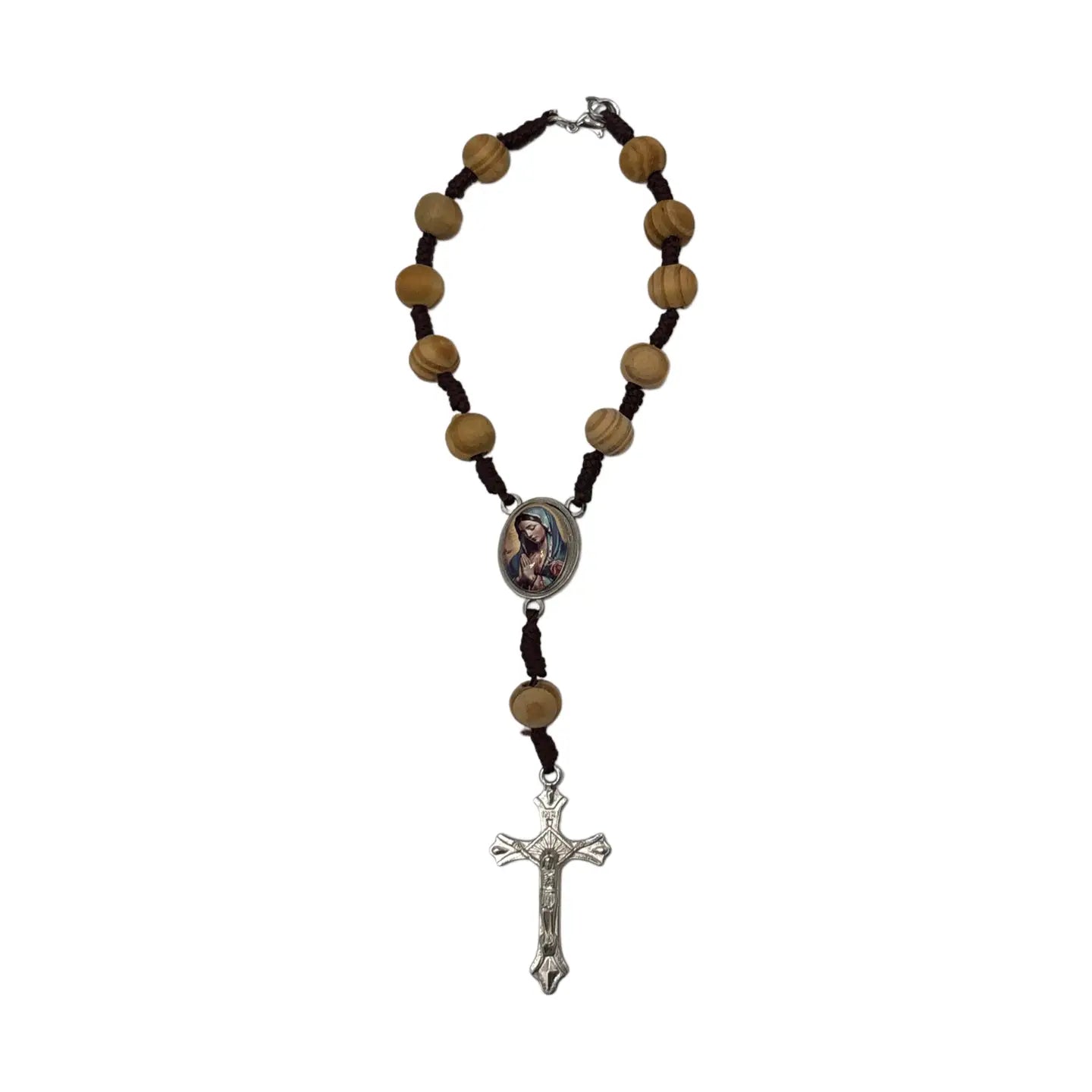 Wooden decade with clasp and metallic emblems of Our Lady of Guadalupe with metallic Cross.